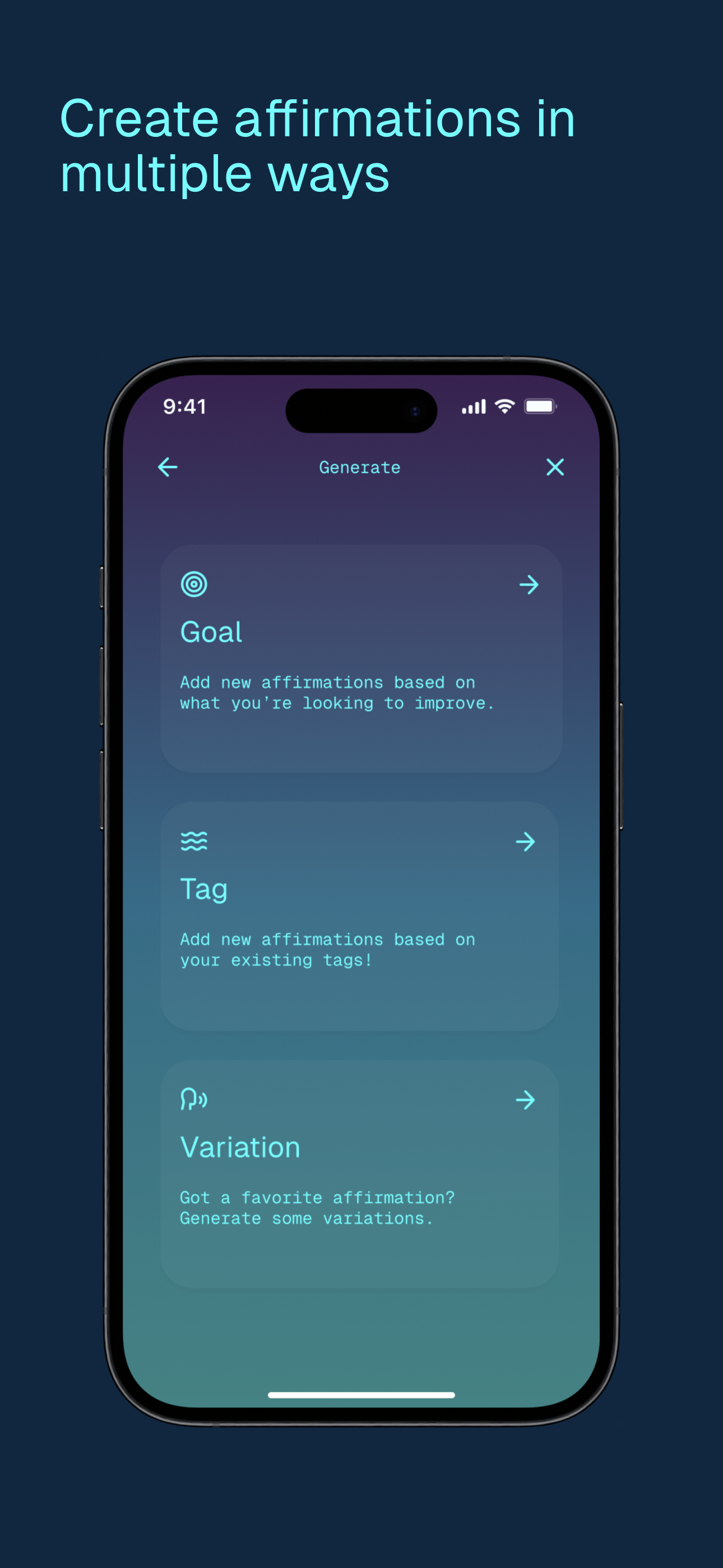 - AI-Powered Affirmations: Generate, filter, and refine “I am” statements until they resonate.